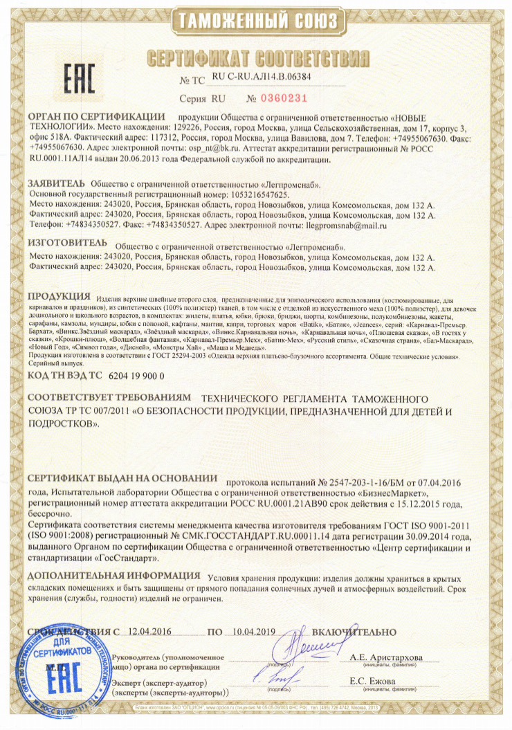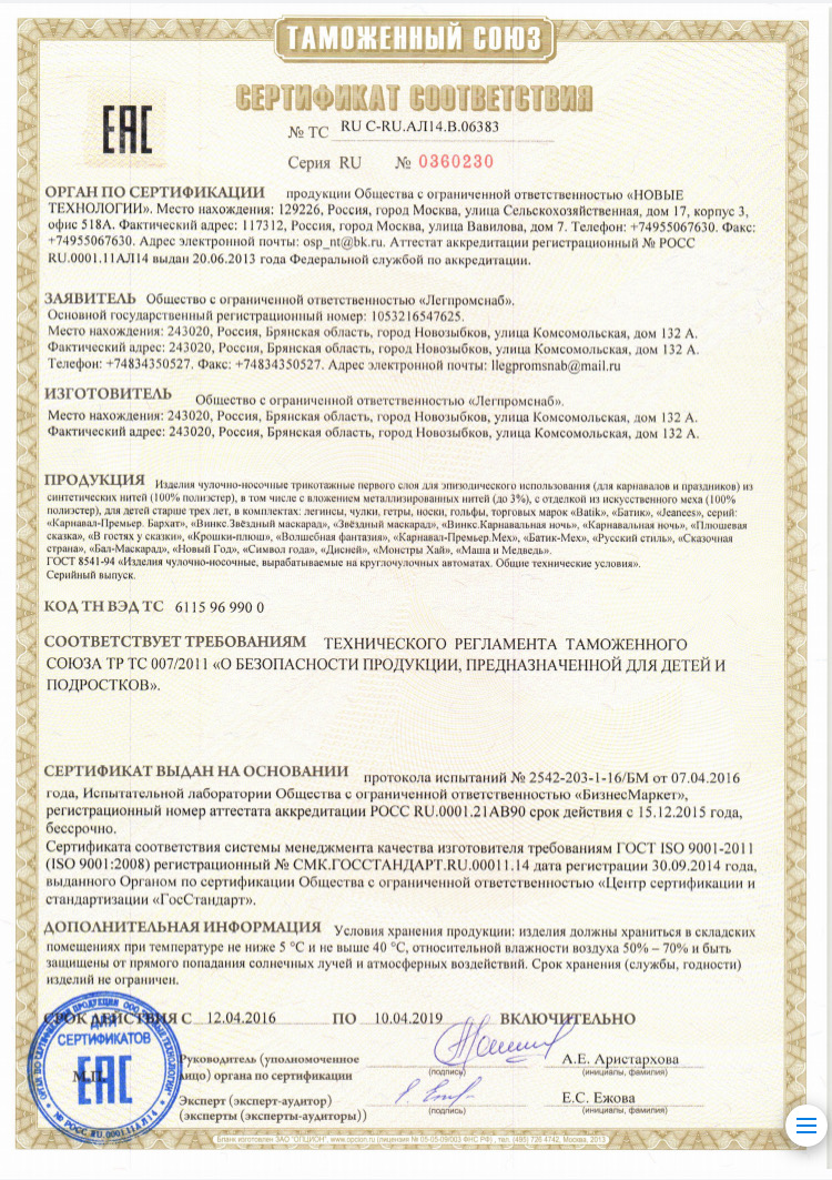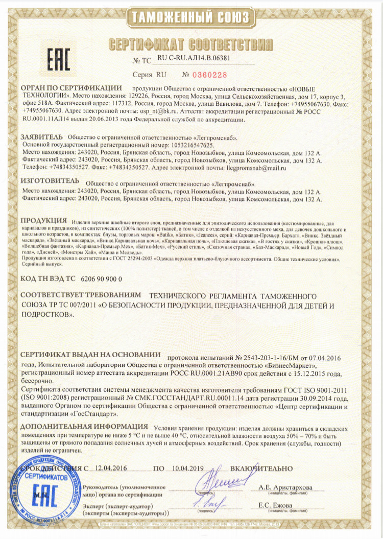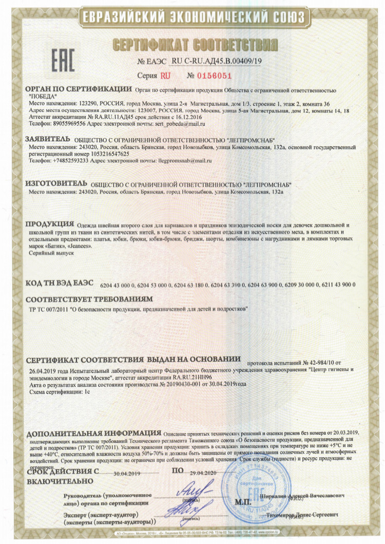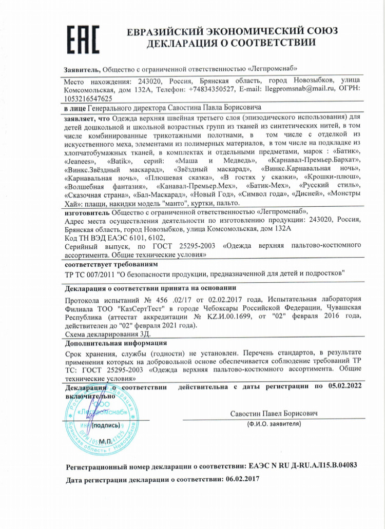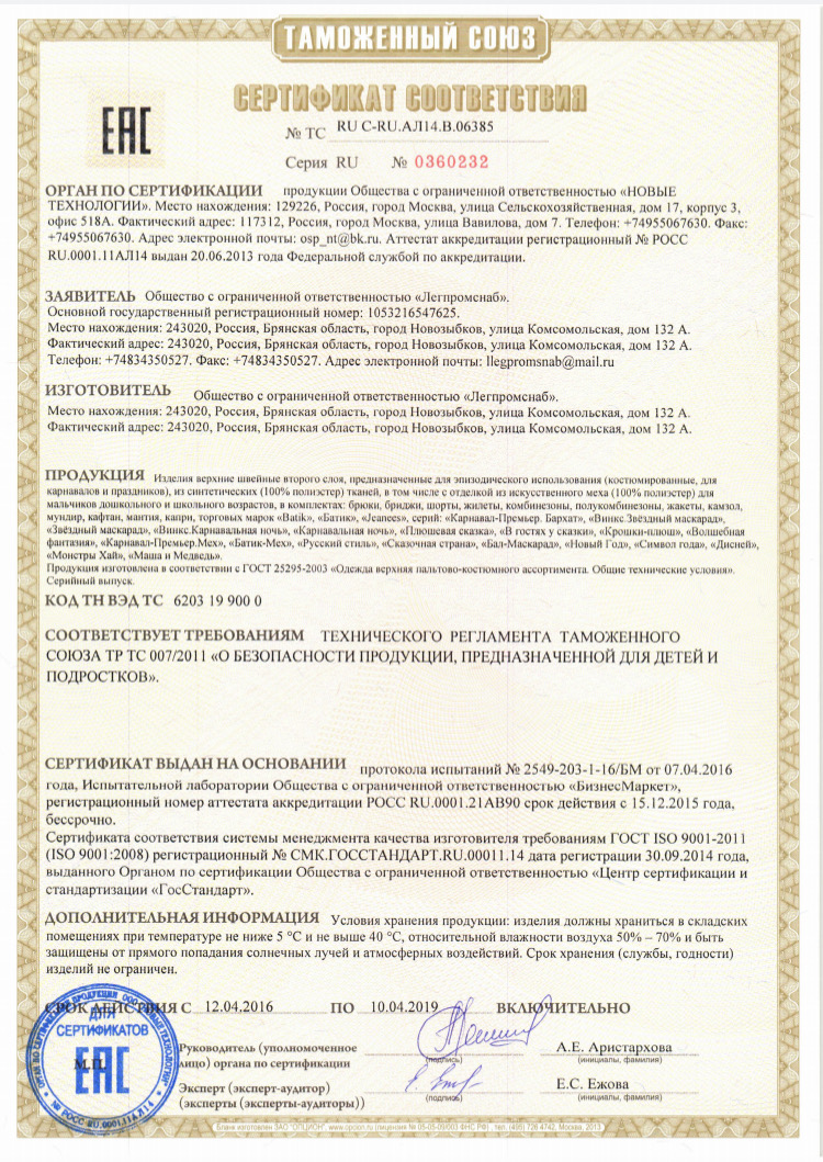 Мы выбираем только костюмы, произведенные лучшими российскими компаниями, и имеющие все необходимые сертификаты.