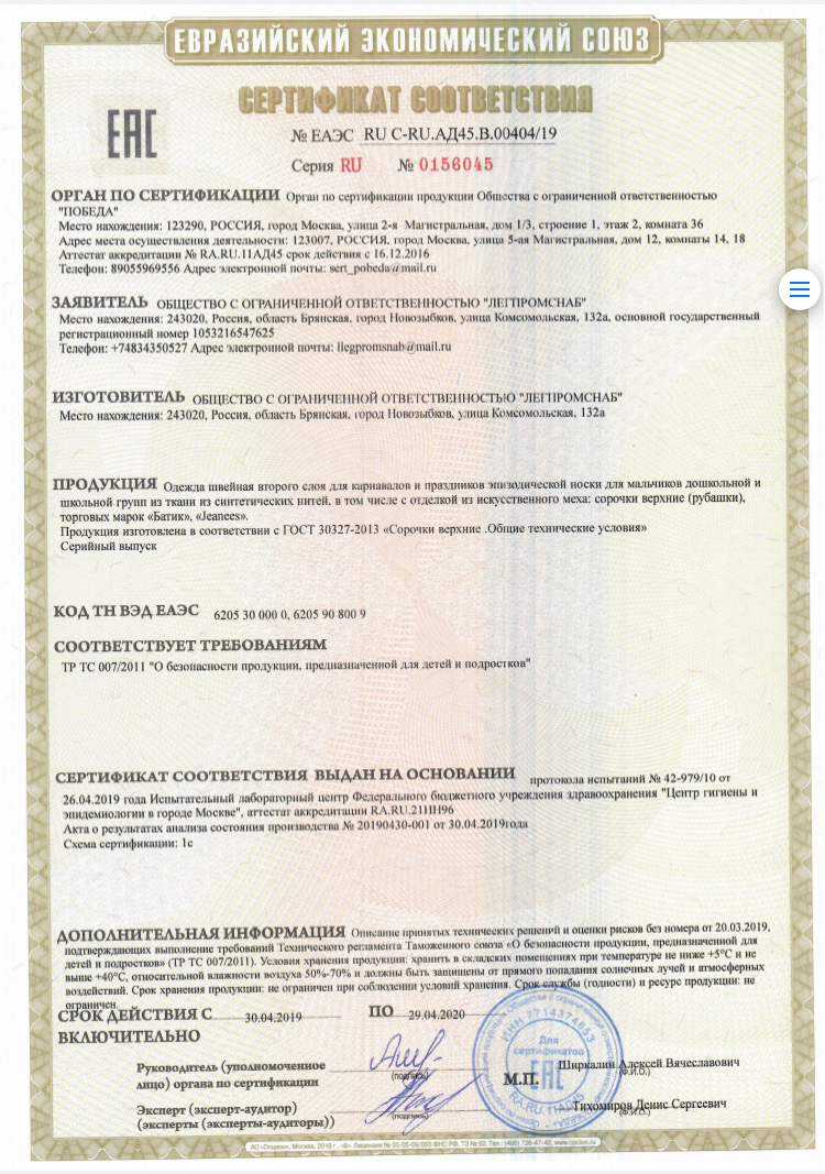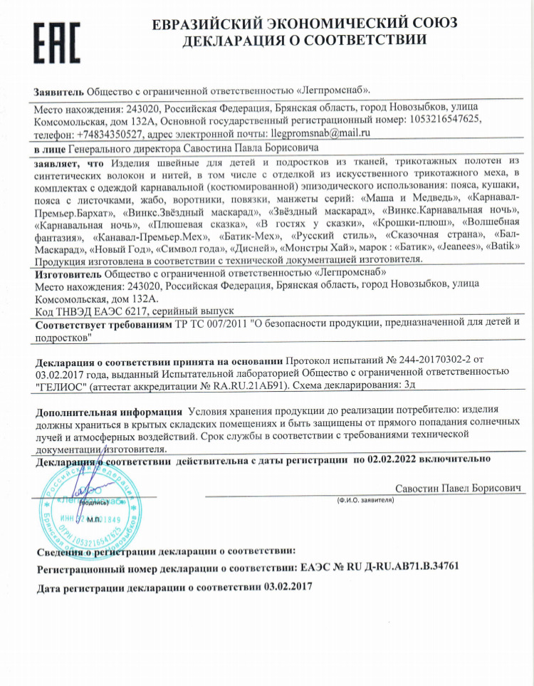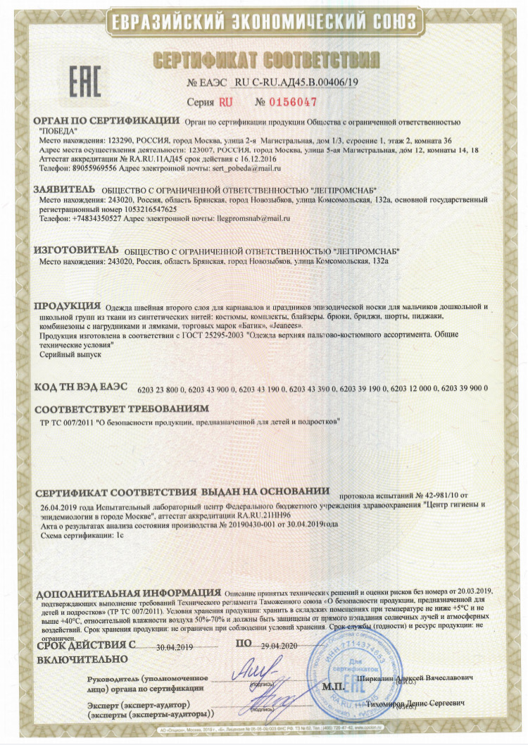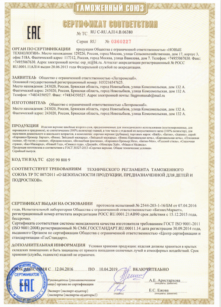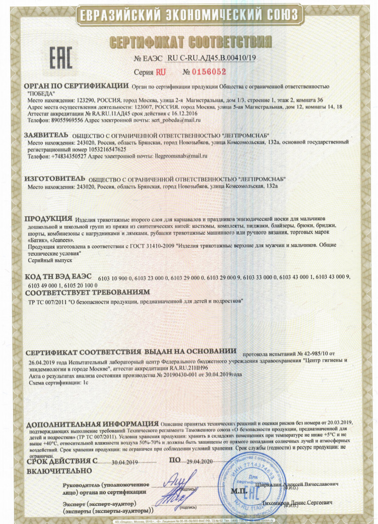 Мы выбираем только костюмы, произведенные лучшими российскими компаниями, и имеющие все необходимые сертификаты.
