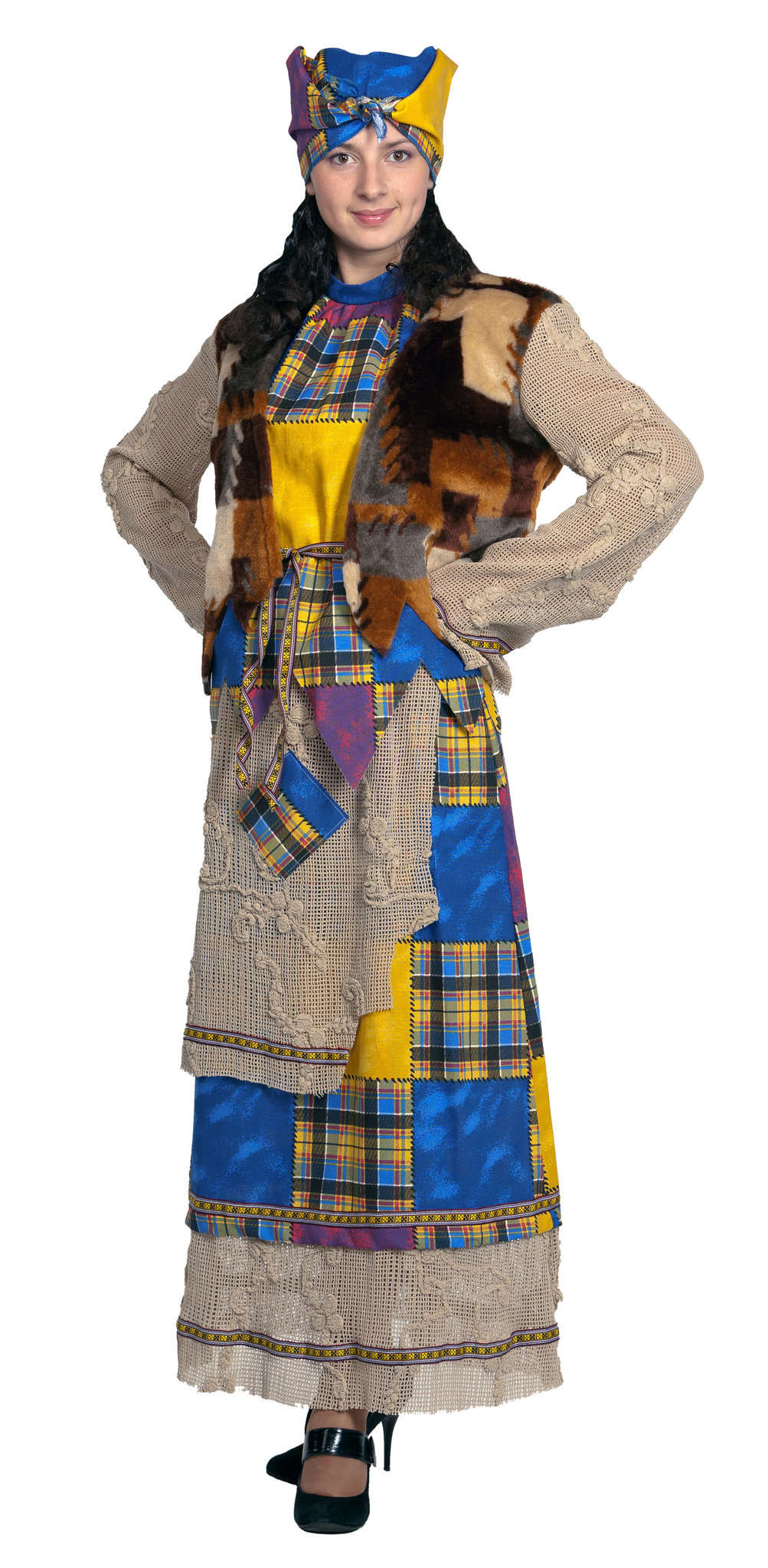 Костюм Бабы Яги состоит из рубахи, поверх которой надевается жилет, юбки с передником и уже завязанной косынки с черными волосами.