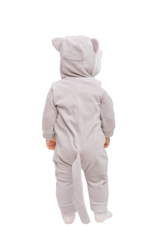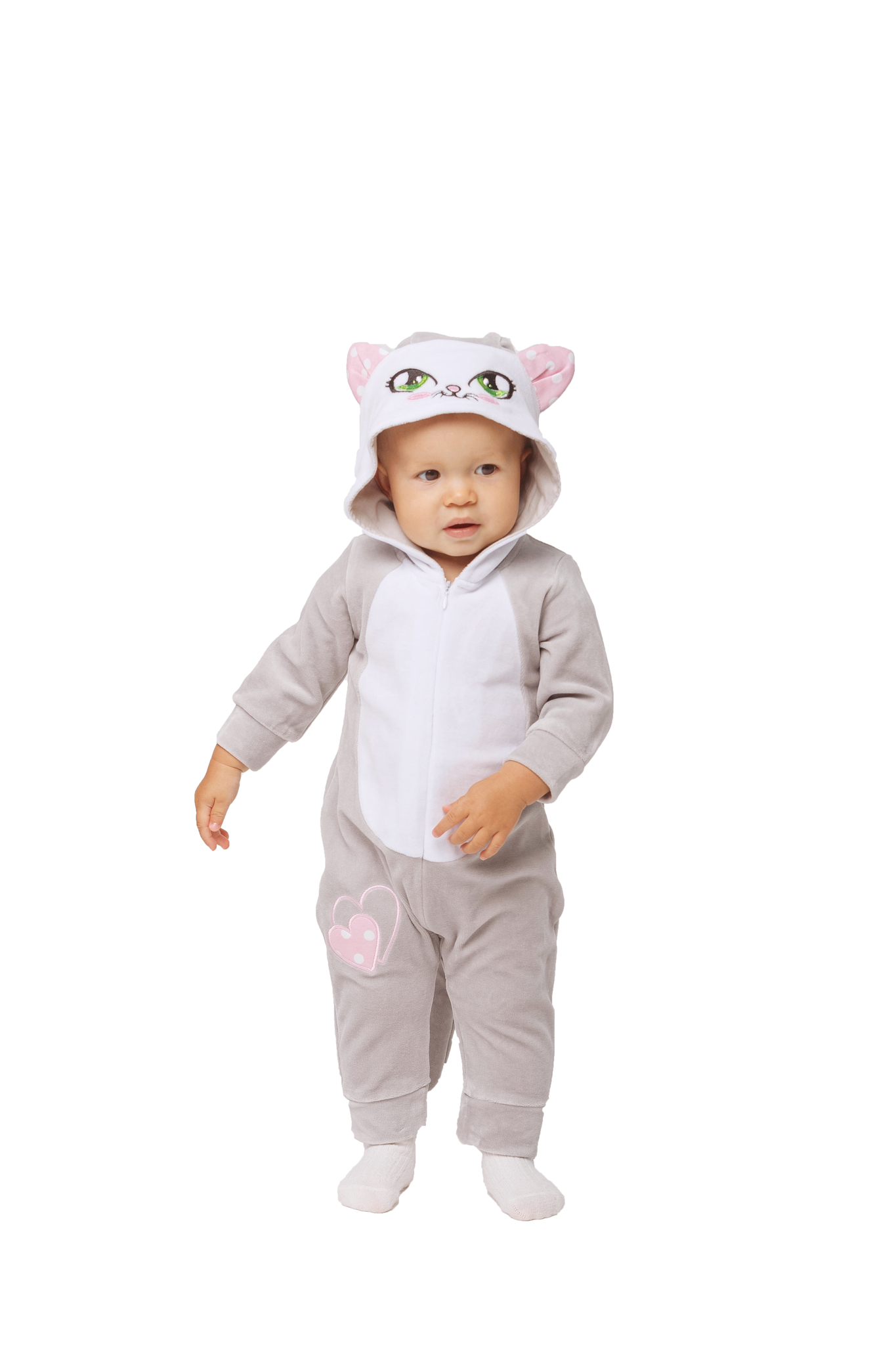 Симпатичный и удобный костюм забавной кошечки для самых маленьких. Наряд представляет собой комбинезон с капюшоном в виде симпатичной мордочки кошки. Спереди застегивается на молнию. Рукава и нижняя часть штанин эластичные.