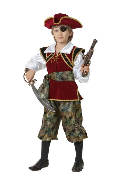 Шикарная комплектация: шляпа-треуголка, длинные шорты-бриджи, камзол с белой рубашкой, пояс в тон бриджам, мушкет, сабля, повязка на глаз.
